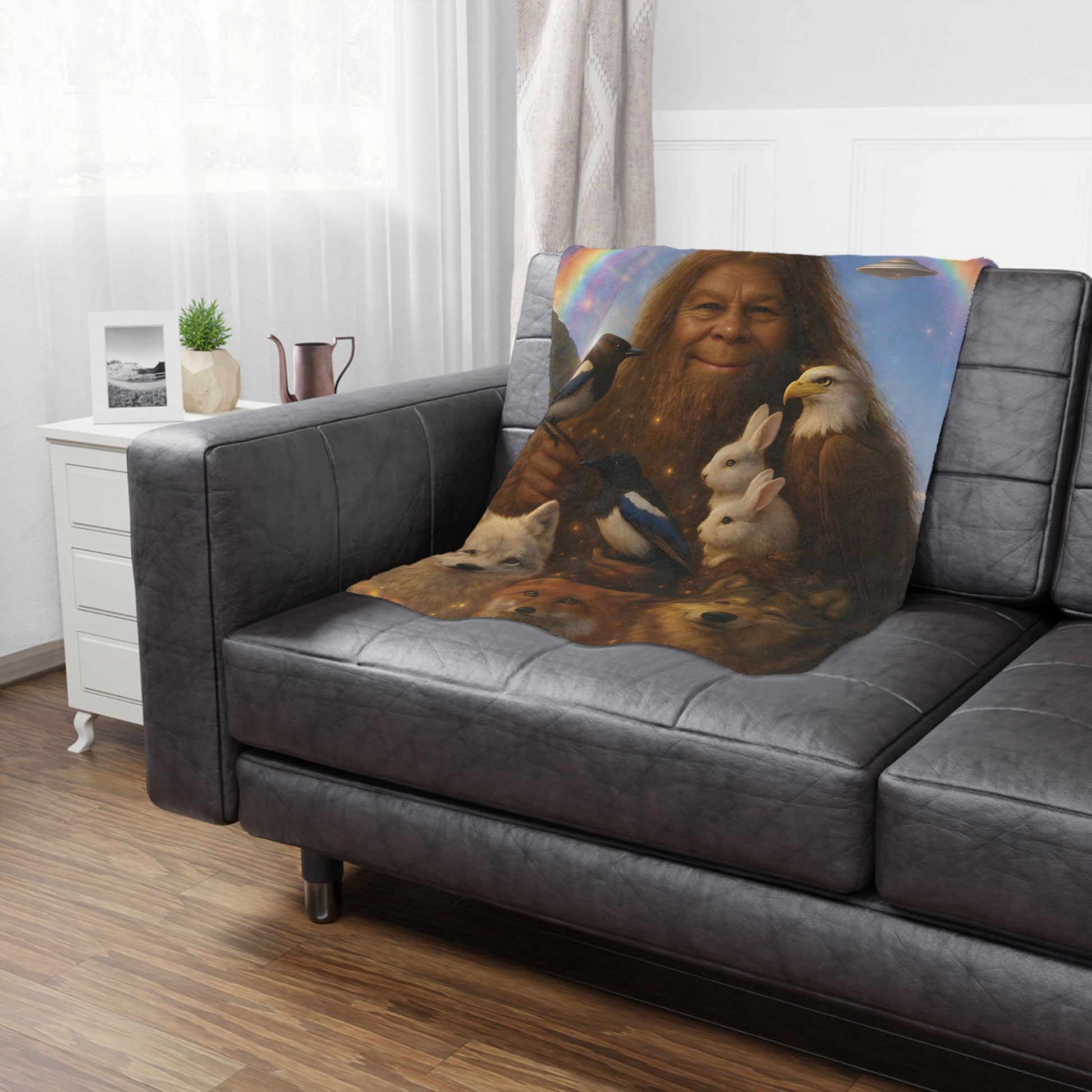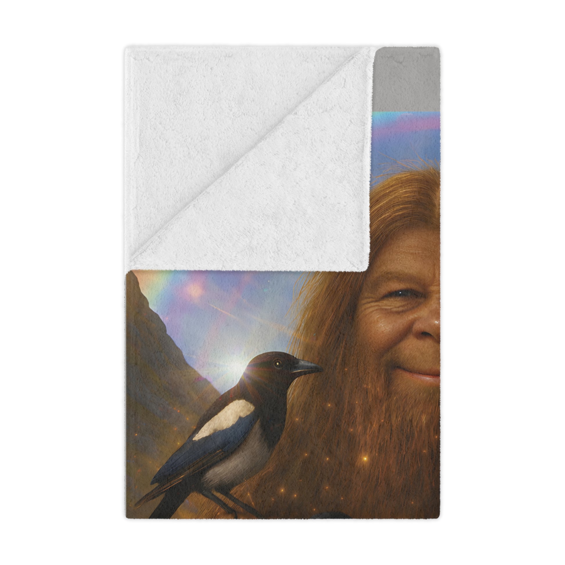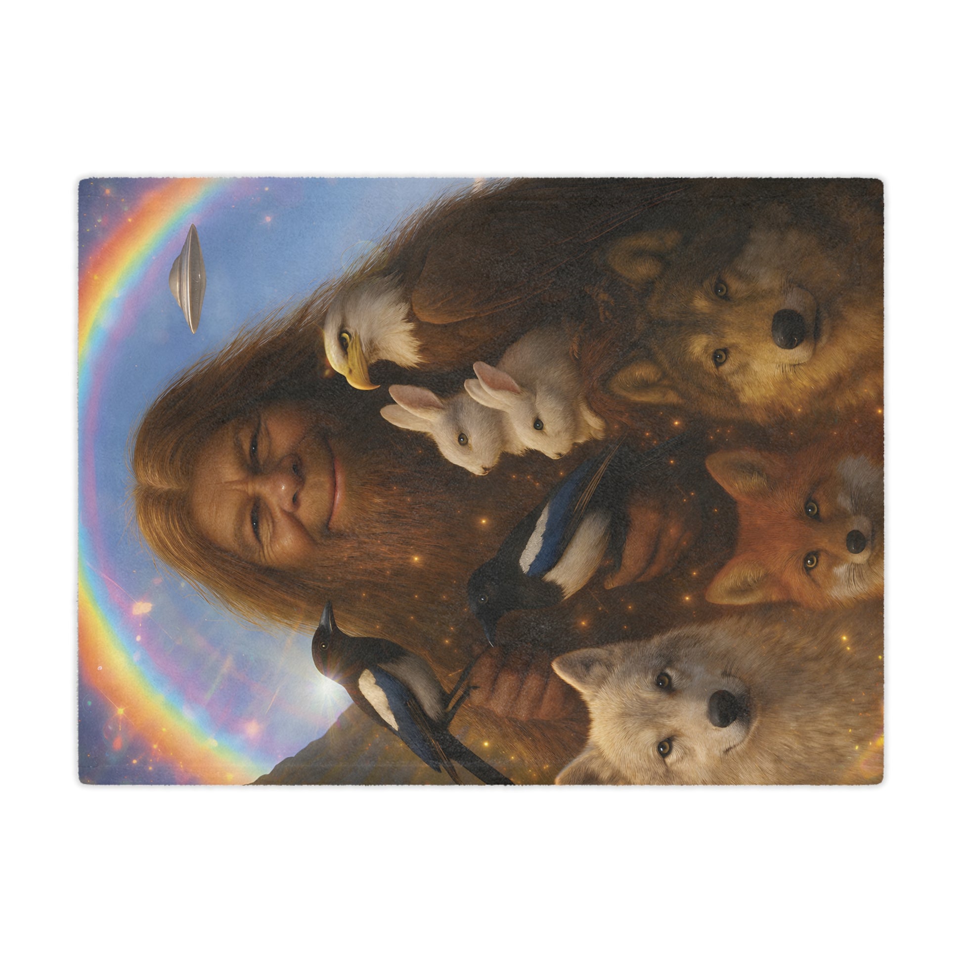 Wrap yourself in a whimsical, cozy scene that feels like a warm storybook come to life. This plush blanket features a gentle, smiling forest guardian surrounded by wolves, foxes, magpies, and soft white rabbits beneath a shimmering rainbow — a blend of folklore, nature, and a touch of wonder. The one-sided, vividly printed design keeps every detail crisp, while the ultra-soft polyester pile invites you to curl up with a good book, settle into a quiet evening, or add a layer of comforting color to your favorite reading nook. Subtle signs of handmade construction give each piece character and a lived-in charm that fits naturally into slow mornings, starlit porch nights, or serene indoor moments with loved ones.