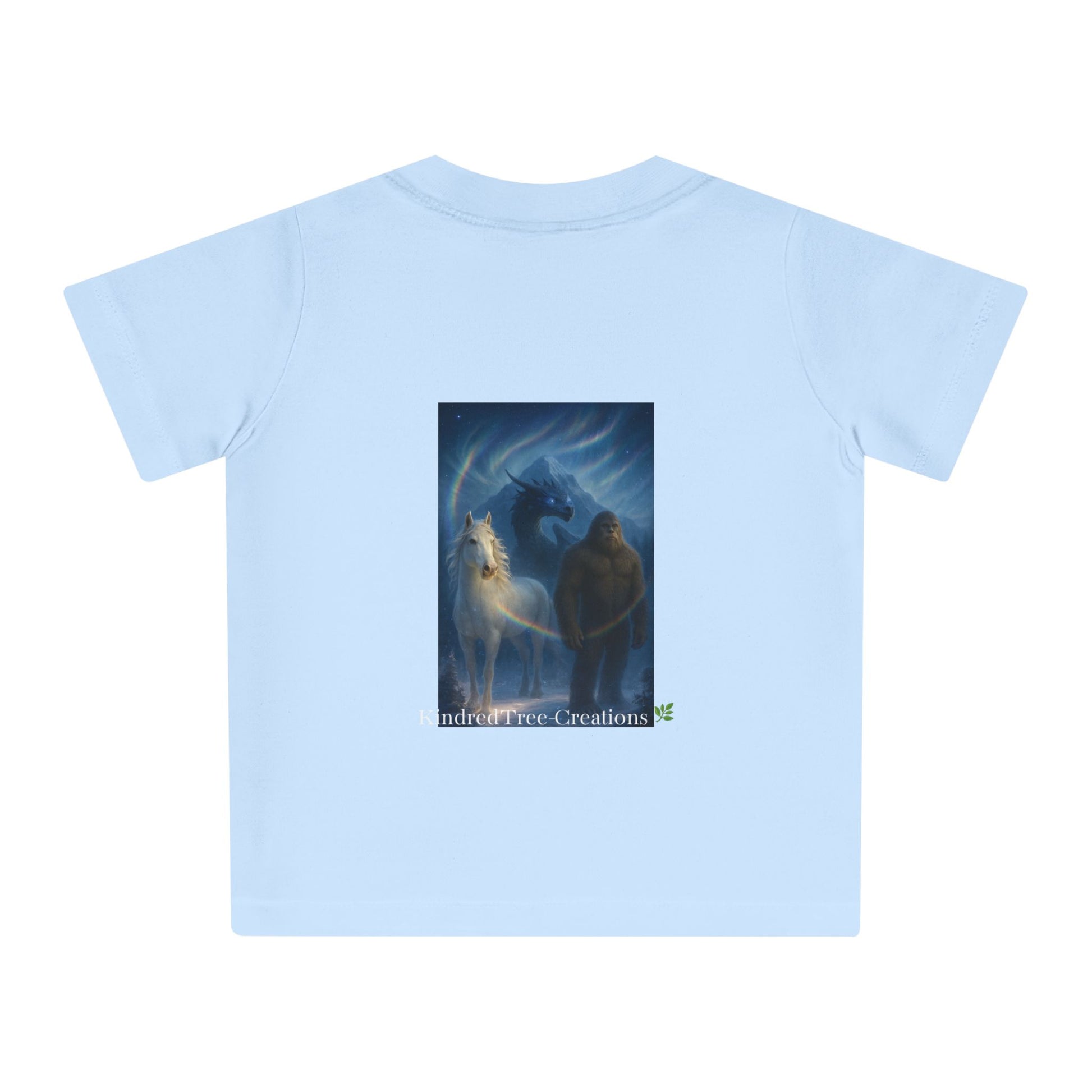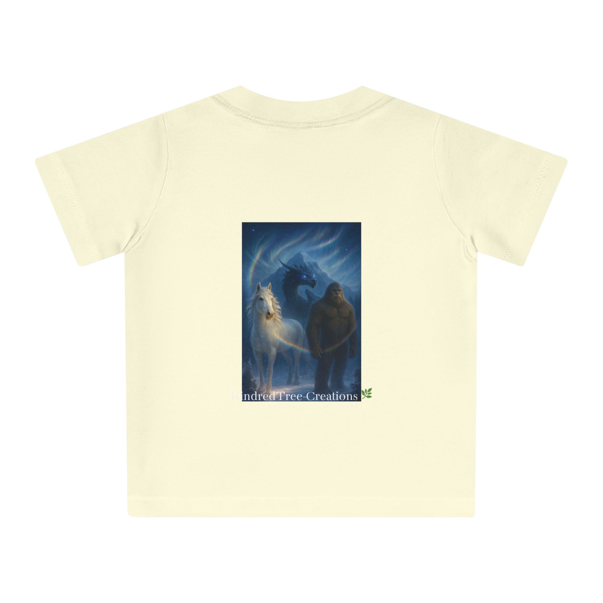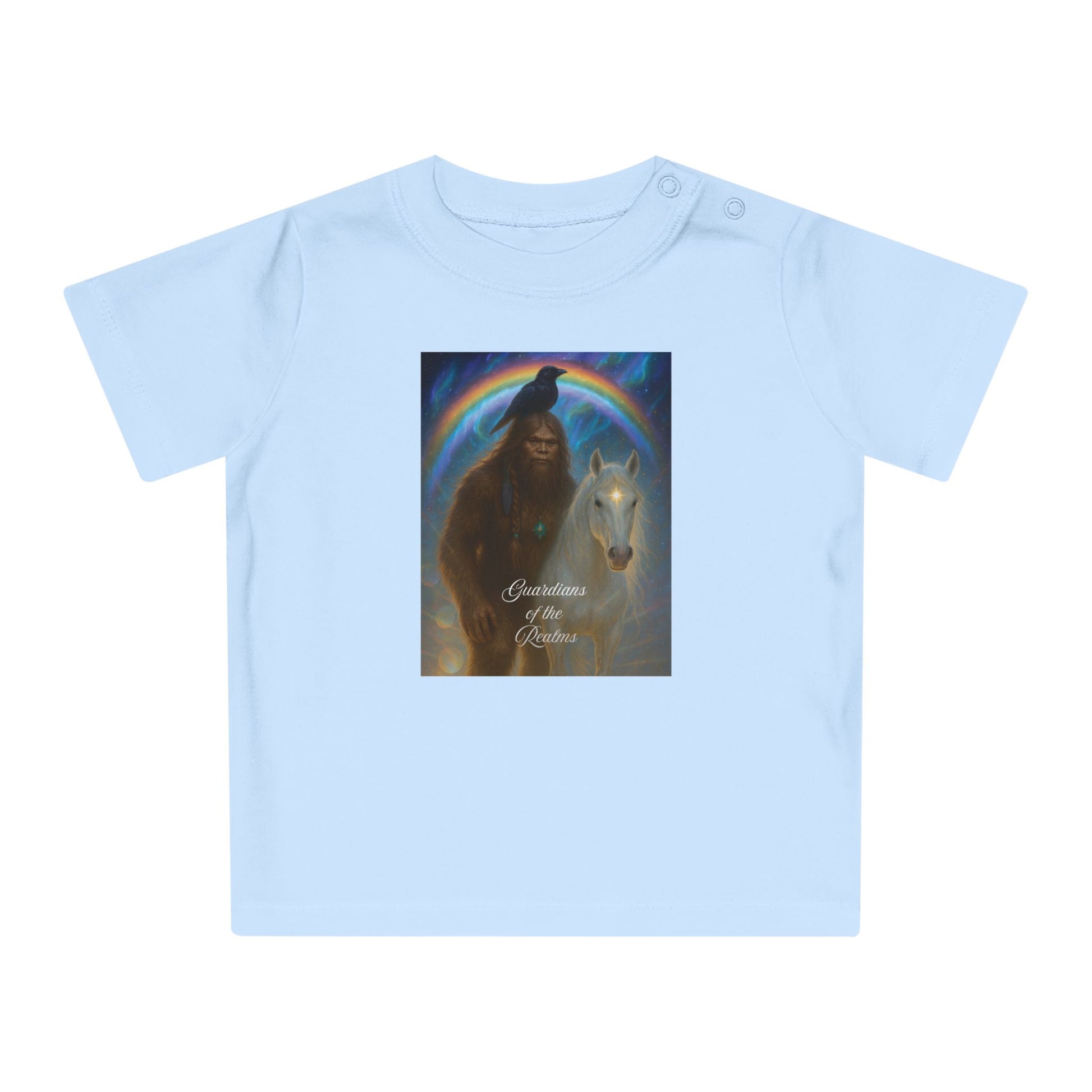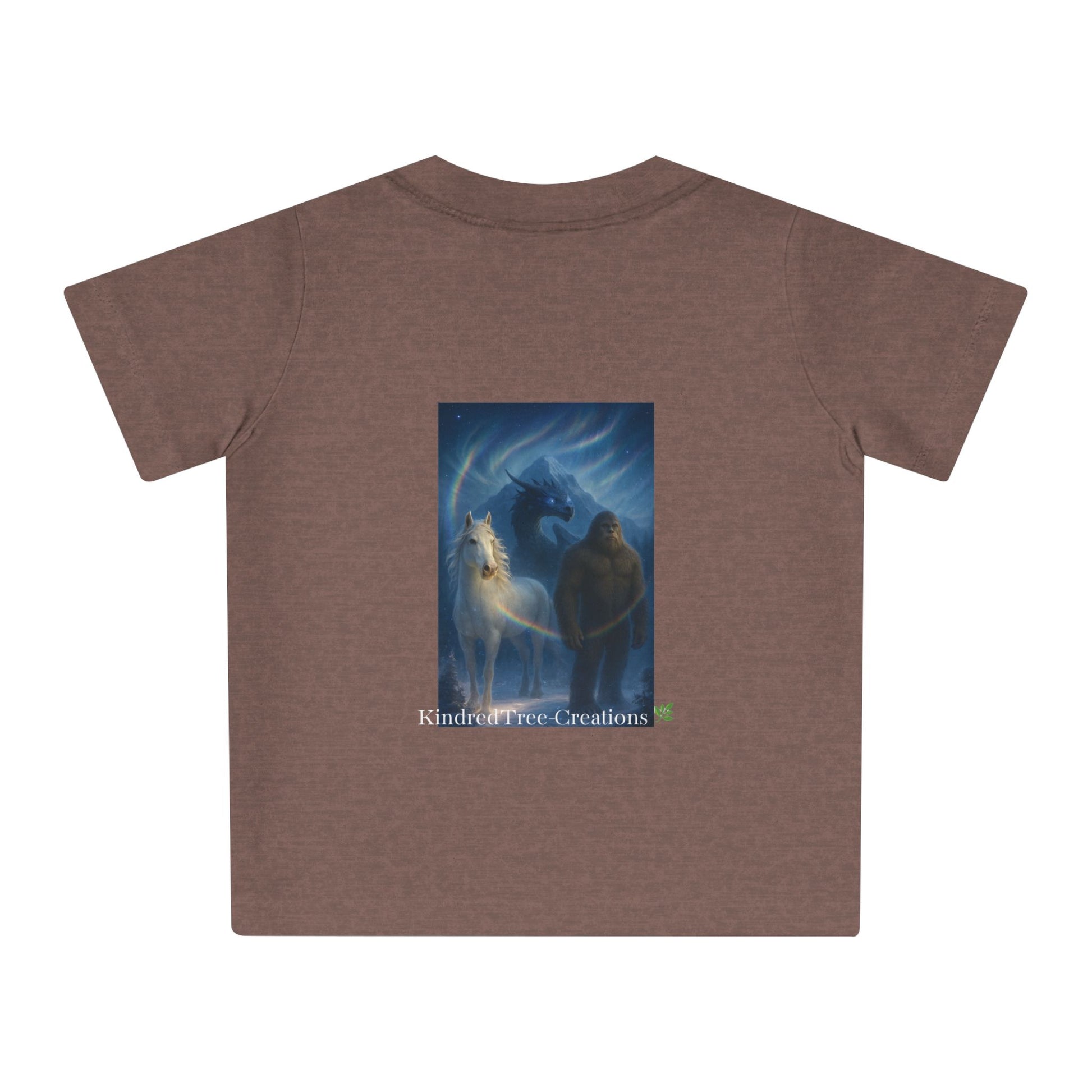 Soft, organic, and quietly powerful — this baby tee brings a gentle legend to everyday playtime. The muted mocha fabric carries artwork of a protective figure beside a pale horse beneath an iridescent halo. The imagery feels like a bedtime tale made tangible: hush-lit moments, small hands tracing lines while a parent hums nearby. Easy to put on thanks to shoulder snaps and a stretchy ribbed collar, this shirt sits comfortably through naps, park visits, and story-reading on the couch. It’s designed for little ones who grow surrounded by warmth, imagination, and a sense of guardianship.