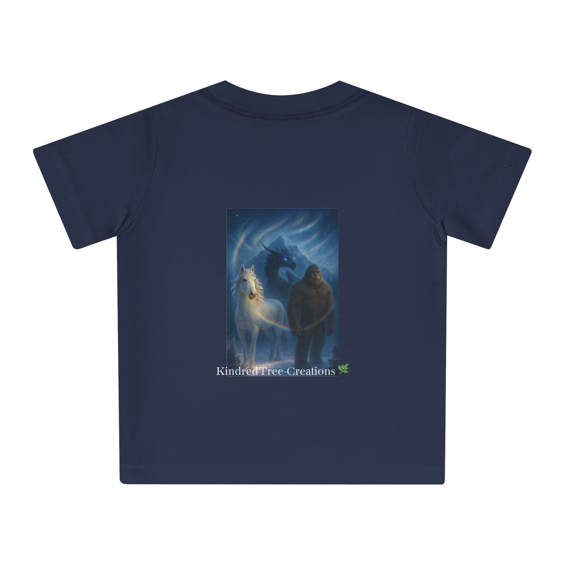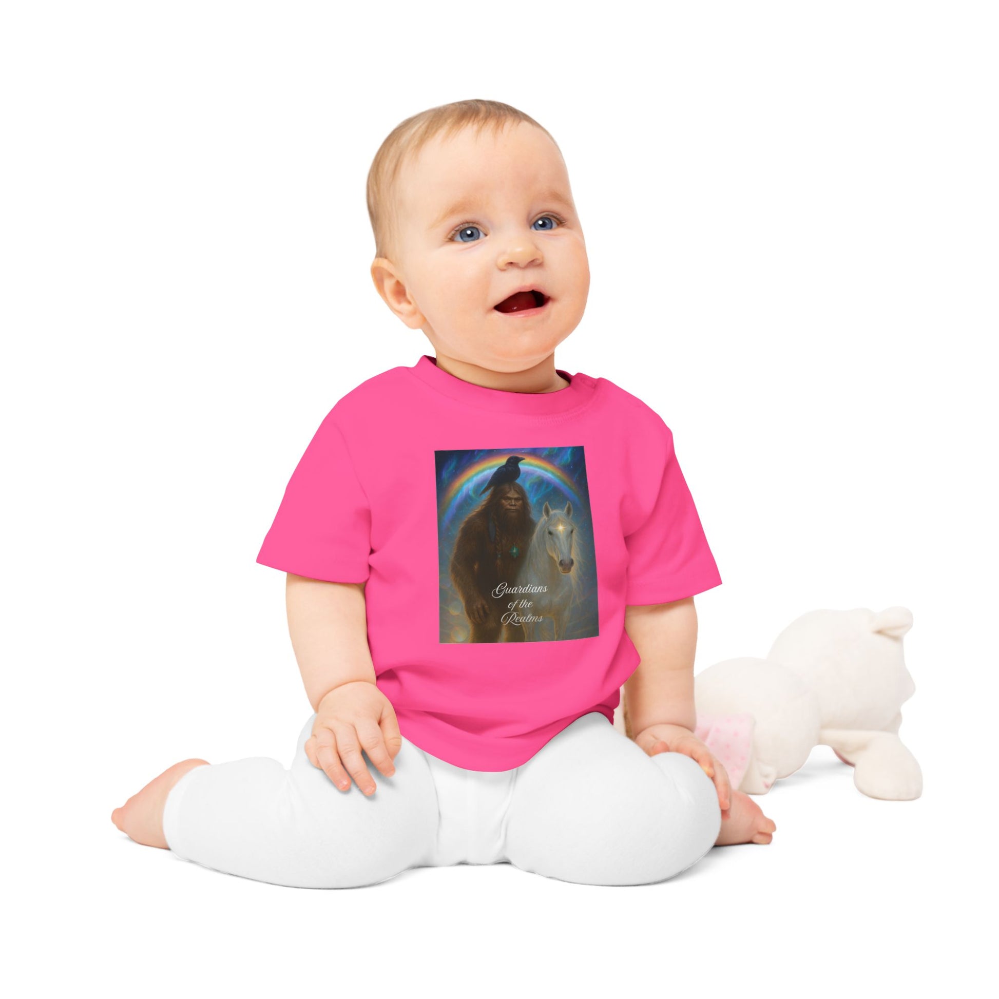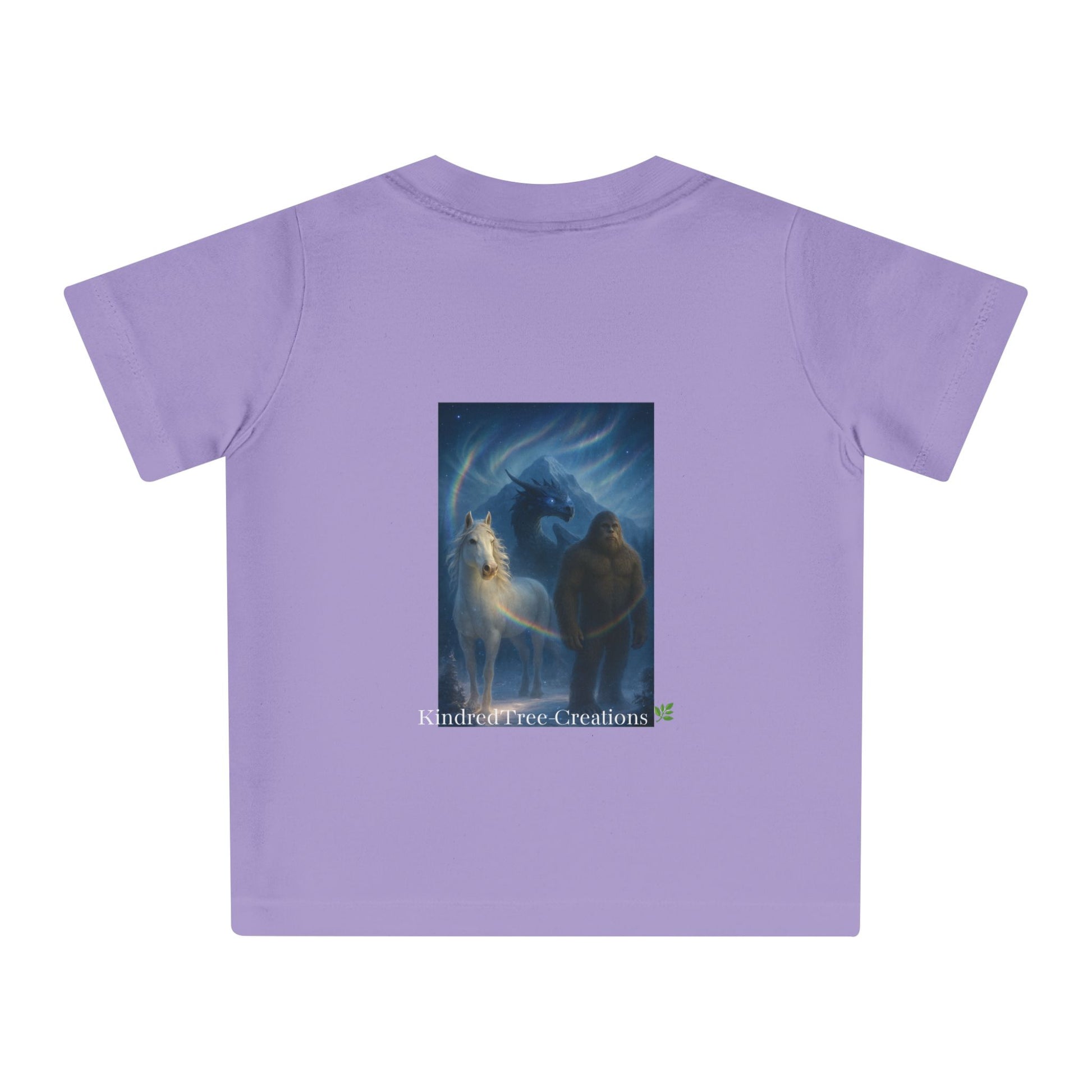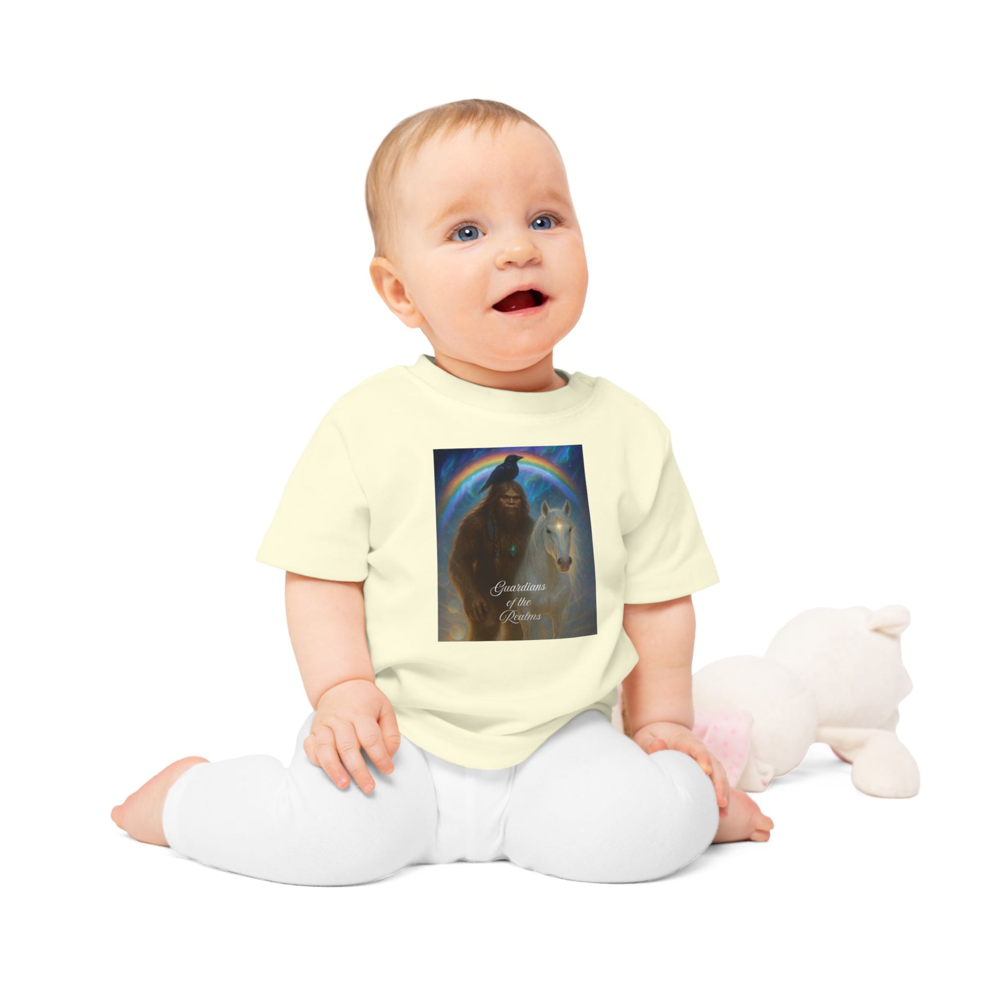Soft, organic, and quietly powerful — this baby tee brings a gentle legend to everyday playtime. The muted mocha fabric carries artwork of a protective figure beside a pale horse beneath an iridescent halo. The imagery feels like a bedtime tale made tangible: hush-lit moments, small hands tracing lines while a parent hums nearby. Easy to put on thanks to shoulder snaps and a stretchy ribbed collar, this shirt sits comfortably through naps, park visits, and story-reading on the couch. It’s designed for little ones who grow surrounded by warmth, imagination, and a sense of guardianship.